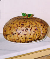 My aunt foolishly left this photo lying about, probably to taunt me further, so I stole it for a quick scan. This, my friends, is a true clootie dumpling: Note the abundance of currents and raisins that permeate its firm yet supple texture. (Also note: Holly is poisonous, so I will not be held liable for anyone silly enough to eat it.)